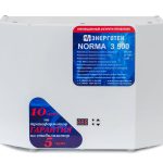 NORMA 3500 ‒ электронный стабилизатор на основе 9-ступенчатого автотрансформатора с тиристорным управлением. Обеспечивает точность стабилизации на уровне ±5,7 % и рассчитан на непрерывную работу в промышленных и бытовых сетях электроснабжения, с номинальным фазным напряжением 220 вольт, частотой 50 герц.